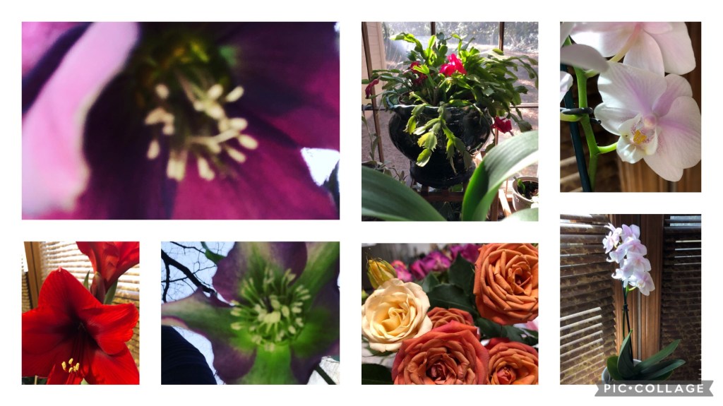 Clockwise from top left: Lenten Rose, Christmas Cactus, orchid closeup and plant, rose mix, Lenten rose, amaryllis.
