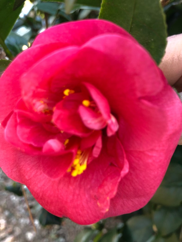 Camellia’s deep rose blooms are a family tradition. My mother preferred pink ones, but I like the more common bright ones. When I was a teenager, my great aunt Ruby’s dog loved to run laps around her rosy Camellia bush, which was almost as big as her garage. Our Camellia had a hard pruning last summer—it was too tall and oddly shaped after a storm, so this year’s blooms are just a few bright spots in the green bush. I’m so glad my mother-in law planted this one years ago.