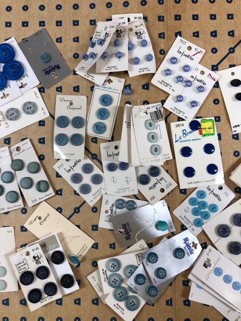 Imagine my surprise when, while looking for buttons, I found we had some of the same buttons, as well as the same shopping tendencies! If you look at the periwinkle buttons at the top of the photo, there’s two sets…Janice’s from Piece Good Shop. (Oh I miss that fabric store!), mine a mark-down from Walmart. Since periwinkle was my favorite color for a long time, I bet Janice bought these for me, but never sewed them up. (Janice’s collection of pink buttons, her favorite color, as well as the sparkly decorative grouping is even larger.). There’s lots of 10 and 25 cent labels through the collection…Mama taught us both to be bargain shoppers, but is it prudent to save this much?