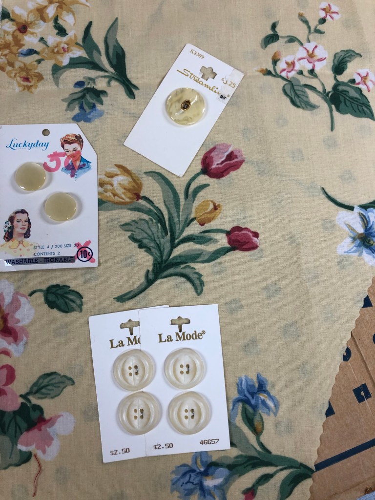 I’m down to buttons, buttonholes and handwork like hemming the jacket. After my walk down memory lane selecting buttons, I think I will use the subtle yellow “Lucky day” marked 5 cents, from my husband’s grandmother’s stash. Then I will cut out and sew a matching skirt and wear a two-piece dress wrapped in lovely memories as I go out and make new ones!