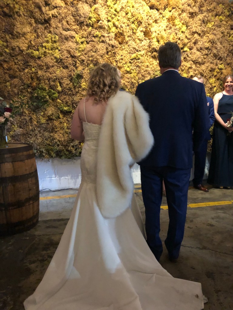 A funny thing happened that illustrates the connectedness of us all…right before the ceremony, Lucy was “hidden away” outside the event hall, in the public space before the processional. A customer took her picture (and offered to get her a drink) and sent the photo to his wife—“look at this bride waiting for the wedding to start.” The wife replied “that’s Lucy and Alex!” The couple are good friends of older daughter Sarah and her husband Brian, but out of context Lucy and the friend didn’t recognize each other. It really is a small world, even in Atlanta!